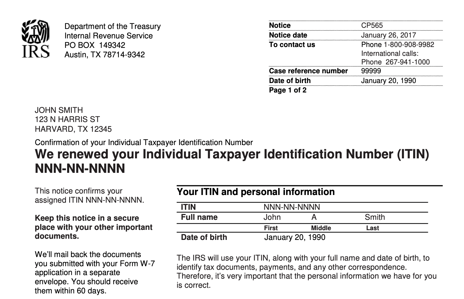 This is what you receive when your ITIN application is approved – your official CP 565 notice from the IRS.